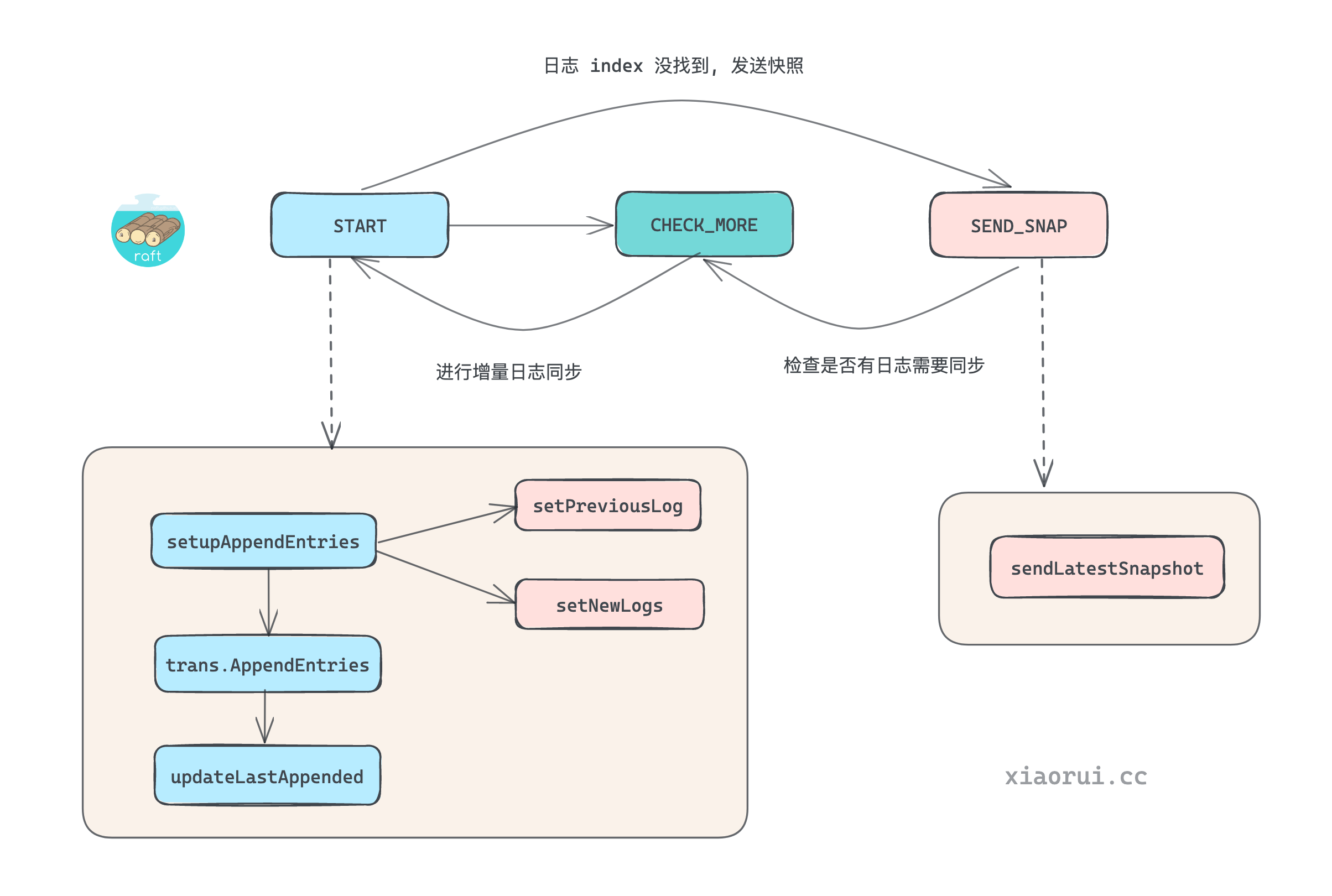然后使用 transport 给 follower 发送请求, 之后更新状态.